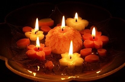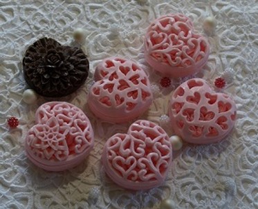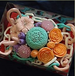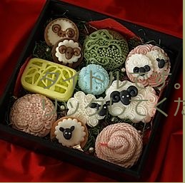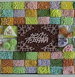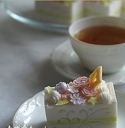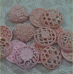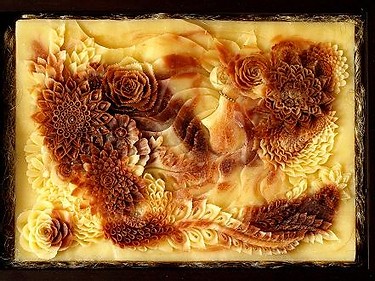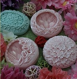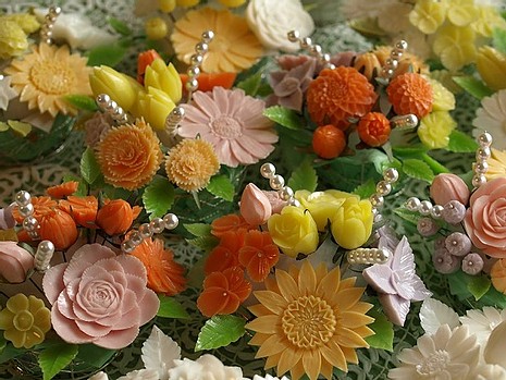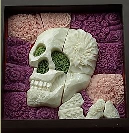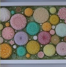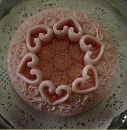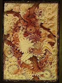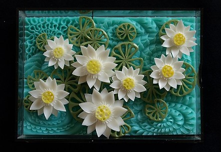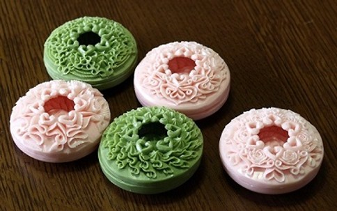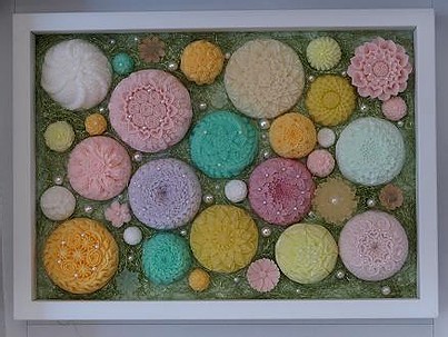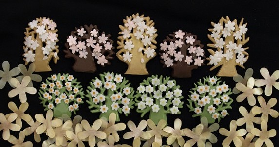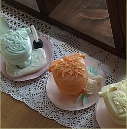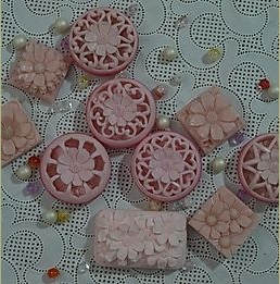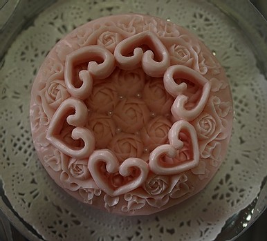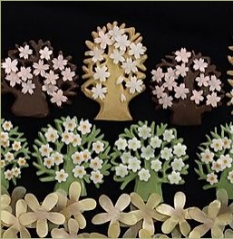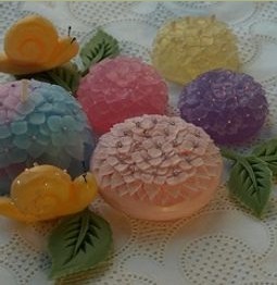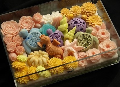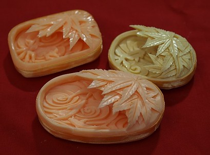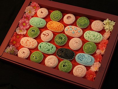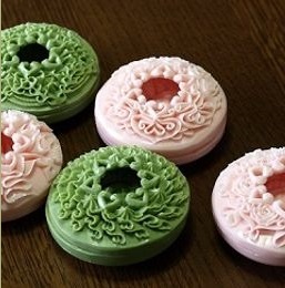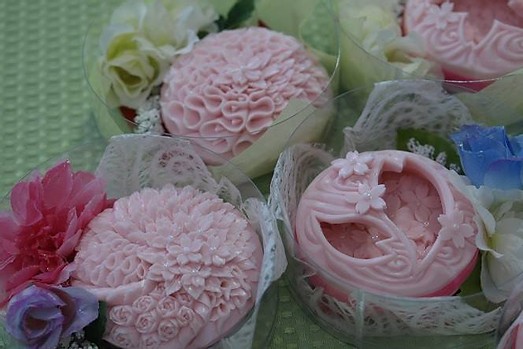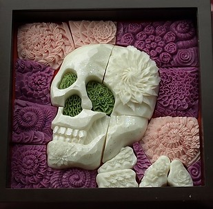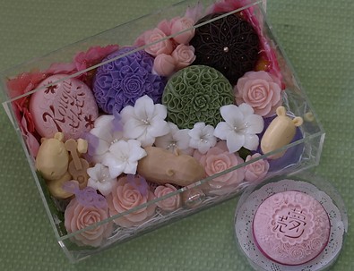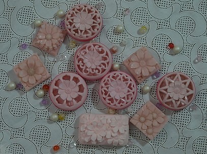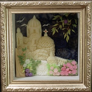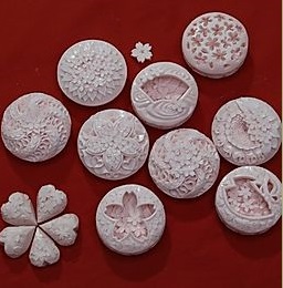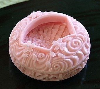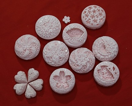 「夜桜と蝶」 桜の大木に、蝶が乱舞する様子を 墨入りマルセイユ石鹸に彫り、上に、市販の石鹸で彫った花びらを貼っています。 |