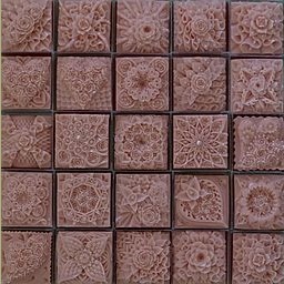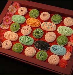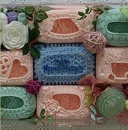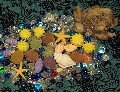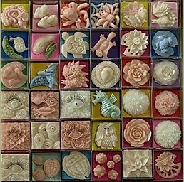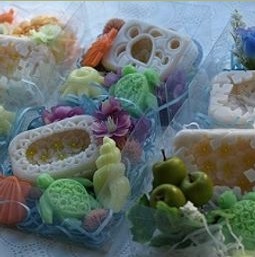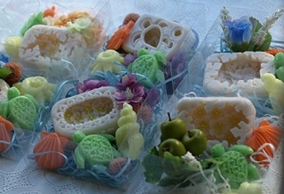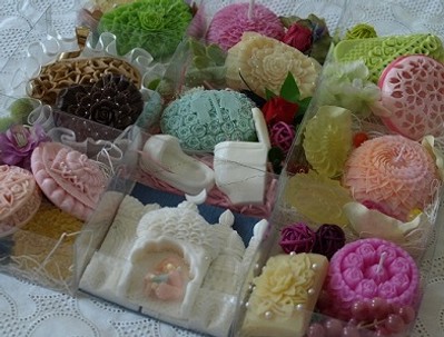 「エーゲ海」 紺のマルセイユ石鹸に空を、無色のマルセイユ石鹸にお城を彫りました。 |
