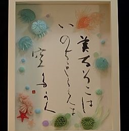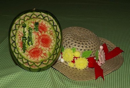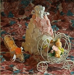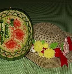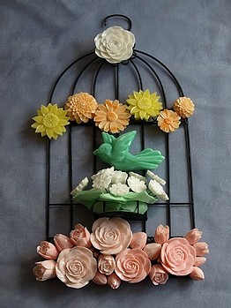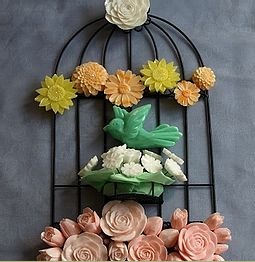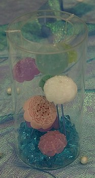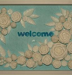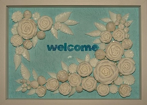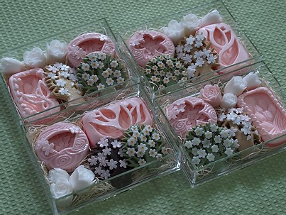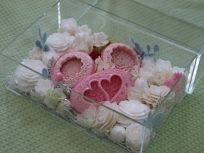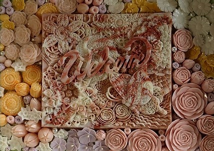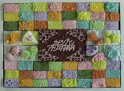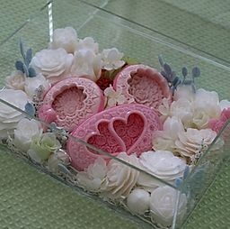「2012 ウエルカムボード」赤を入れた手作りマルセイユ石鹸に、蝶と花を彫りこみ、周りを切り出し花で囲みました。 |