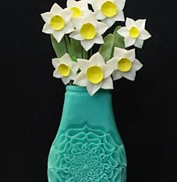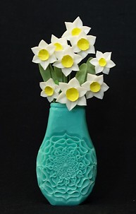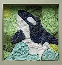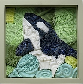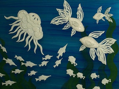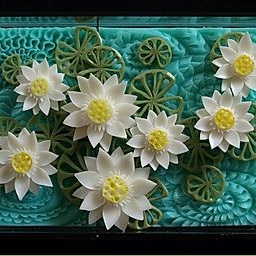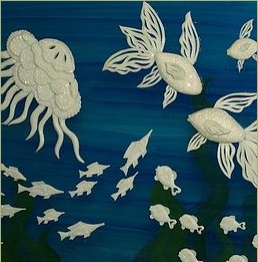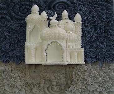「千夜一夜物語のお城」藍色の花々と空、グレーには池にうつる様子、白でお城を彫りました。 |