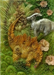 「ジュラ紀にワープ」手作りマルセイユ石鹸に恐竜2頭と植物を彫り、アクリル絵の具で着色しています。 |