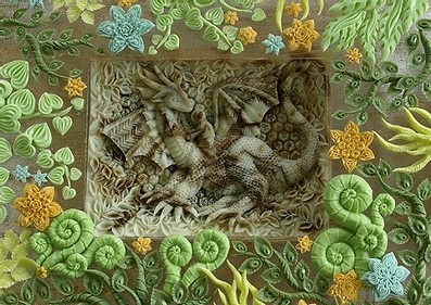 「パフのいる森」 ポール&マリーの「Puff The Magic Dragon」をテーマに、2段のアクリル板に彫りました。 |