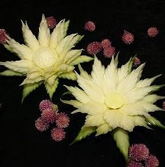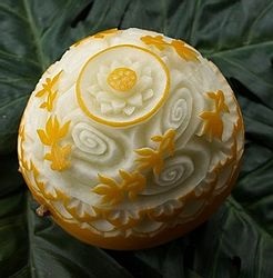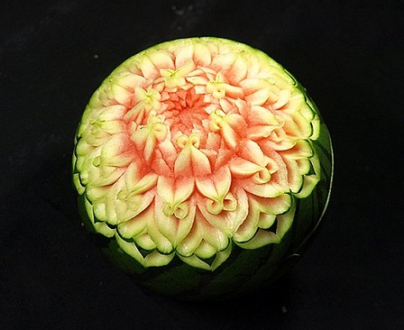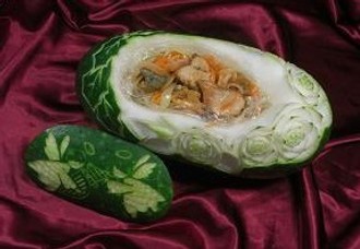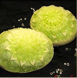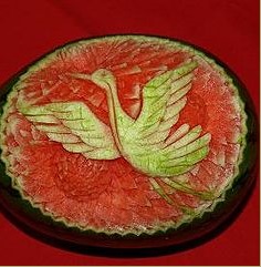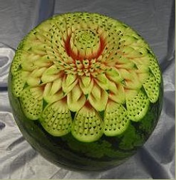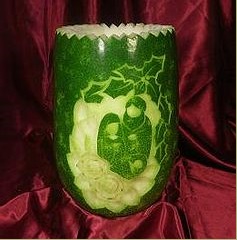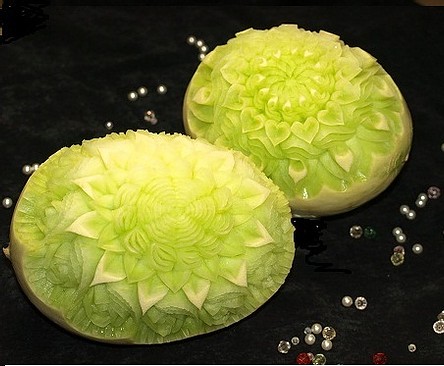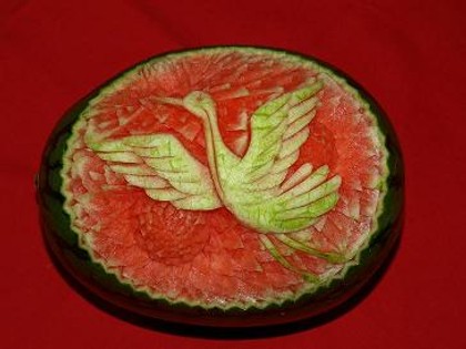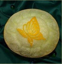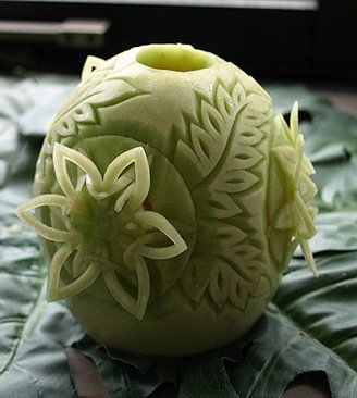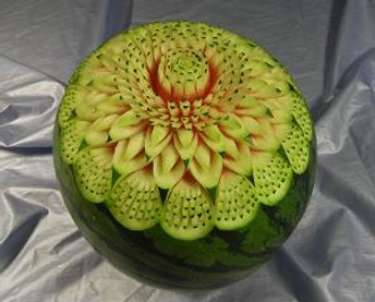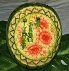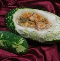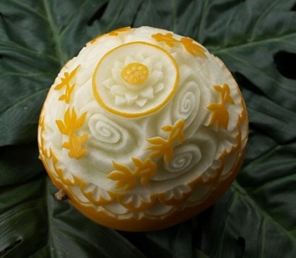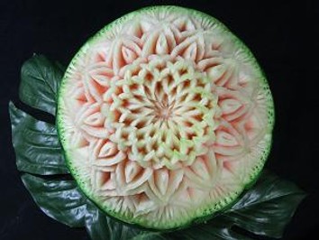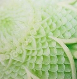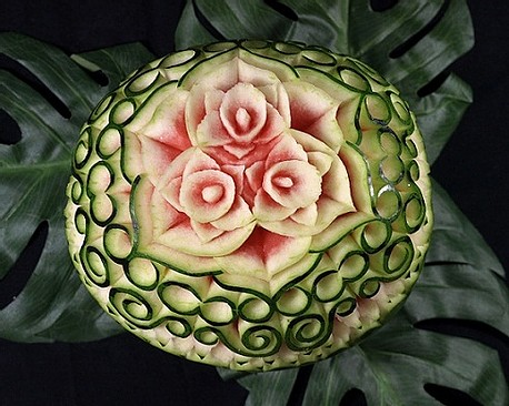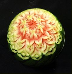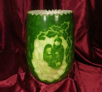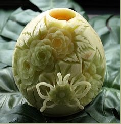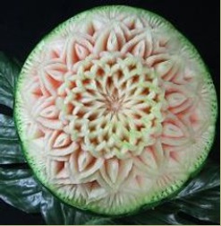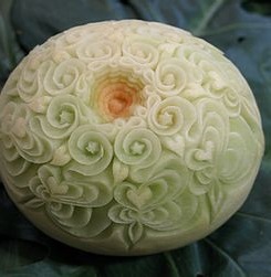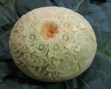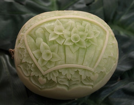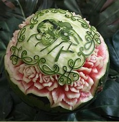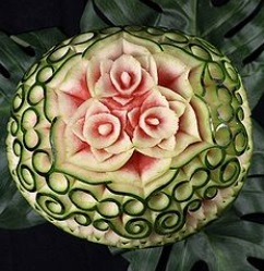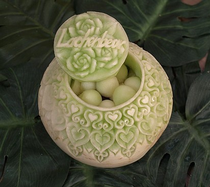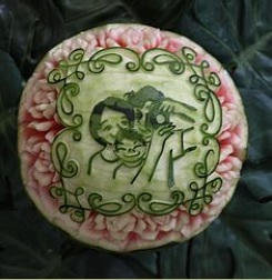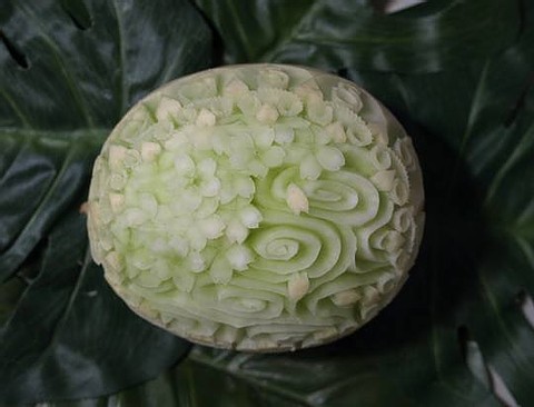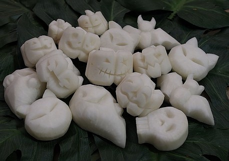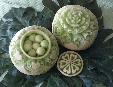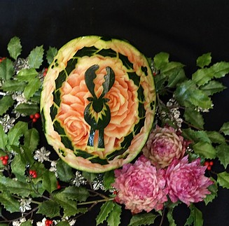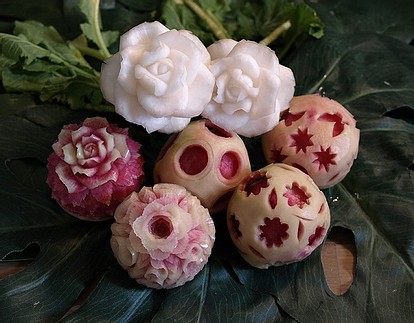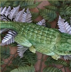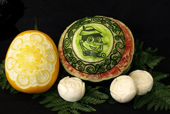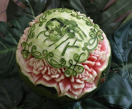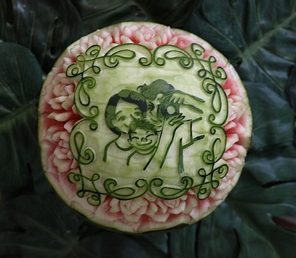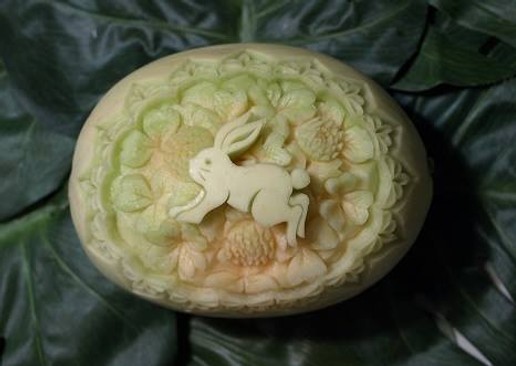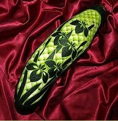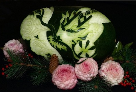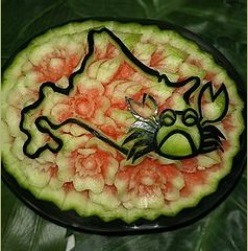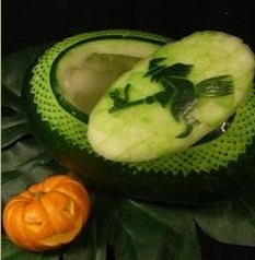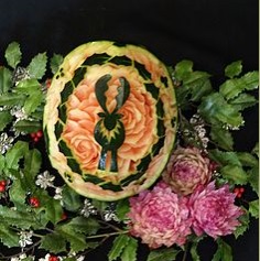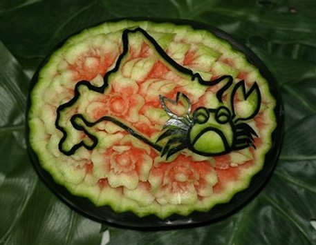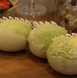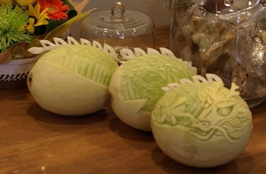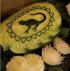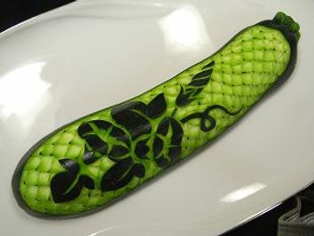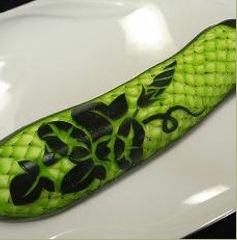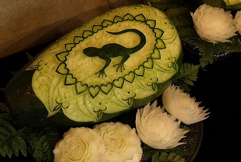「ズッキーニのワニ」巨大ズッキーニにワニを彫り、食紅で色を付けているので、そのまま焼いて食べられます。
